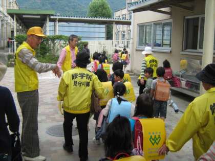 避難訓練の後,1年生を対象に下校コースにある「110番の家」を確認しながら下校しました。多くの見守り隊の方々や保護者の方々に参加していただきました。