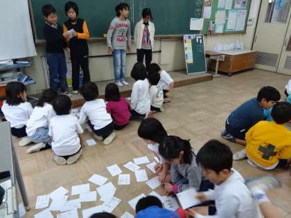 今日の朝学習の時間は,環境委員会のお兄さんお姉さんが委員会活動で作った「環境カルタ」で遊びました。環境委員の人が読み札を読んでくれて,1年生の子どもたちが,カルタ取りをしました。地球温暖化や節約について書かれている札がありました。