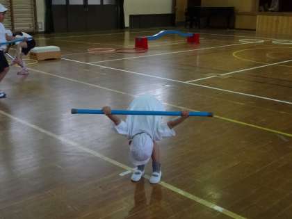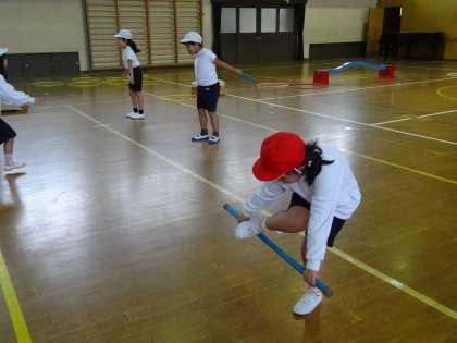 体ほぐしの練習に棒を使って足を抜く練習と棒を背中から前に持ってくる練習をしました。はじめは,「できない。」と行っていた子どももだんだんと慣れてきたのと体が柔らかくなってきたので棒をうまく回せるようになってきました。また練習をしていきます。