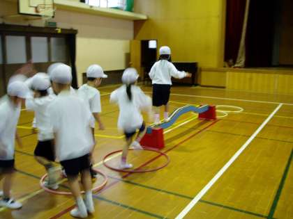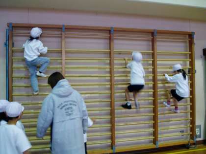 今日も平均台と肋木と輪転がしをしました。最初は怖がっていた子どもも,だんだん慣れてきて色々な渡り方や転がし方ができるようになってきました。