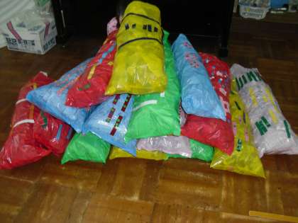 ビニル袋に新聞紙をちぎって入れて、蛇の胴体を作っています。今日は15体出来ました。胴をつなげて蛇にしていきます。