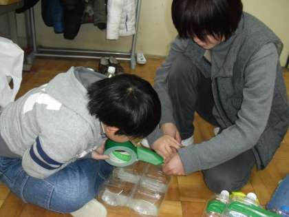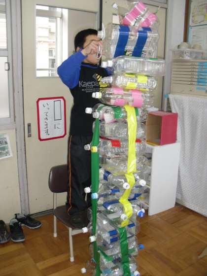 夏休み前から集めていたペットボトルを使って、蛇の家作りが始まりました。2本ずつガムテープではり、それを組み合わせて高い家を作る予定です。