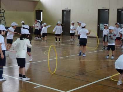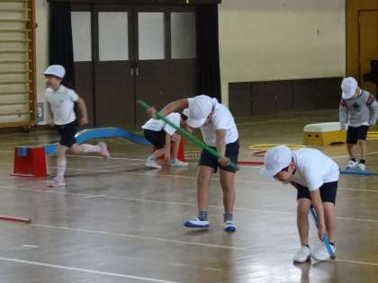平均台と肋木以外に,フラフープや棒を使ってリレーをしています。体をほぐす運動にもなるので,繰り返ししていきたいです。