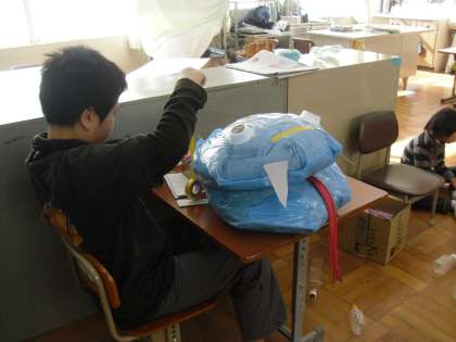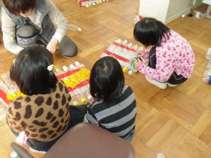 蛇の頭が出来上がりました。また蛇のすみかの屋根もペットボトルをつなげて作りました。先日作った柱にうまくのせたいです。