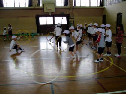 体育の準備運動に輪をつかってしっかり体を温めて,棒をつかって柔軟運動をします。