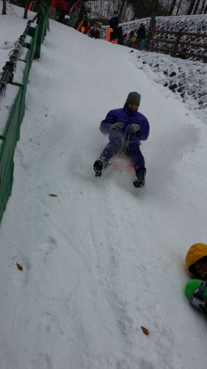 いよいよソリ滑りです。写真ではわかりにくいのですが,かなりの急斜面です。