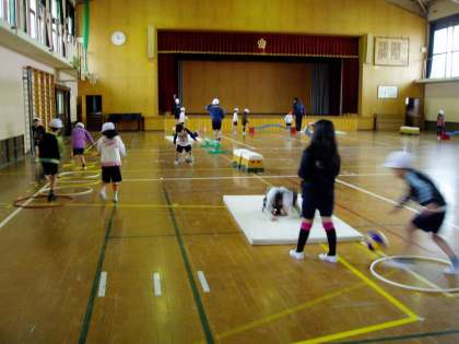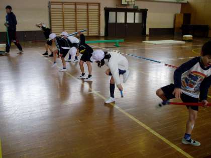 寒いので,準備体操でしっかり走って,体を温めてから,活動しています。