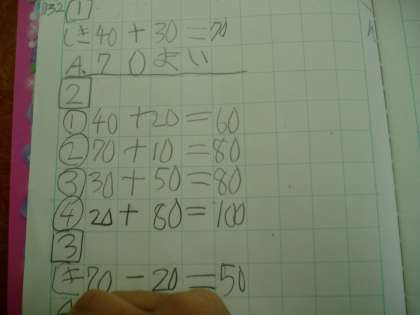「100までのけいさん」の単元にはいりました。大きい数になりましたが,○十たす○十や○十ひく○十の計算は速くできました。