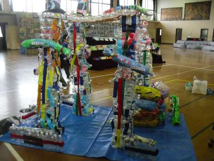 造形展準備をしました。今まで作った蛇の家を組み立てました。そして大きな蛇を柱に巻きつけ、小さな蛇は回りや柱に飾りました。見に来てください。