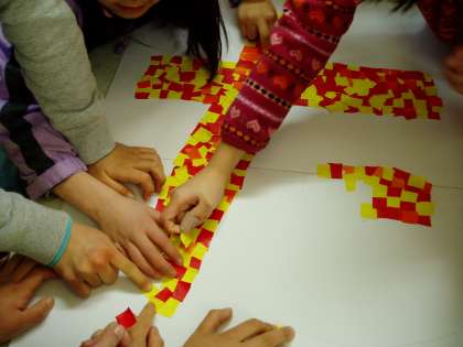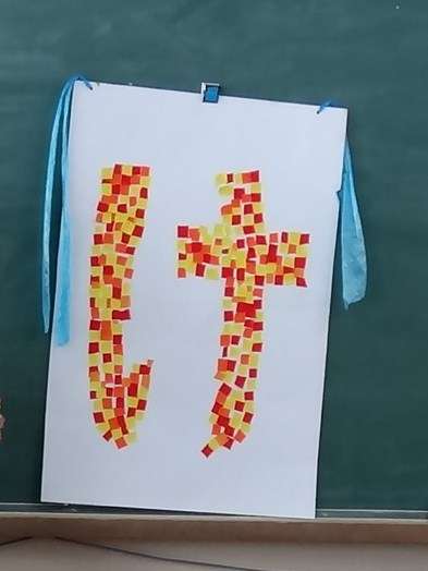 6年生を送る会で飾る飾りを作っています。折り紙を切って,貼り合わせて大きな文字を作りました。全クラスが1文字ずつ文字を作っているので,全部揃うと,6年生へのメッセージが出来上がる予定です。
