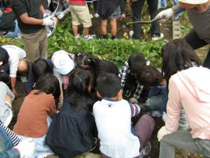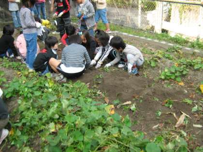 北校舎の北側にあるおいも畑に2年生が集まりました。2組ずつ分かれて「いもほり」をします。日当たりがよい所とそうでない所とでは,おいもの大きさにかなり違いがあるようです。さて,そのお味は…。