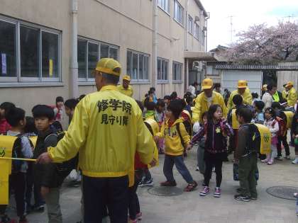 1年生が入学して3日目となりました。今日も,下校時には,多くの「修学院見守り隊」のみなさんにお世話になりました。総勢120名という人数なので,学校教員だけでなく,見守り隊の方々や学童保育所・児童館の職員さんにもサポートいただきながら,1年生は安心して下校することができています。今後とも宜しくお願いします。