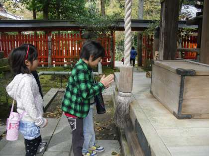 町たんけんで,赤山禅院に行きました。赤山禅院は申(猿)の5日に赤山に詣でると吉運に恵まれると言われており,子どもたちには猿を見つけることと,春を見つけることを課題に出しました。子どもたちは屋根の上にある猿や境内の桜の花などを見つけてとてもうれしそうでした。また,鐘をならしてお参りするすがたも見られました。