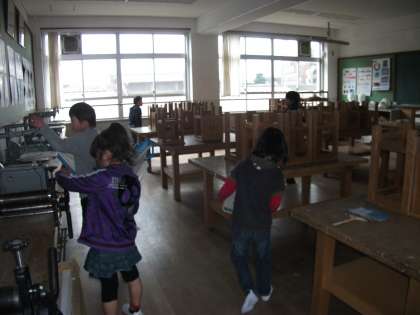 学校探検をしました。探検カードをもって,見学が終わった教室にシールを貼ったり,鉛筆でしるしをつけたりして探検しました。入ったことのある教室でも,興味深く観察していました。初めて入る教室では,何に使うのか不思議そうに見ていました。