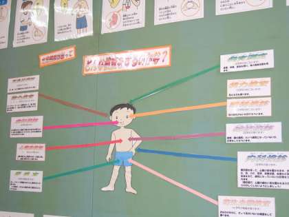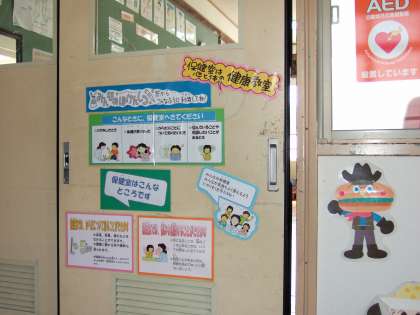 お子様に「からだの事をもっとしってほしい。大切にしてほしい。」という想いから保健室の入口と保健室内の掲示板を新しくしました。