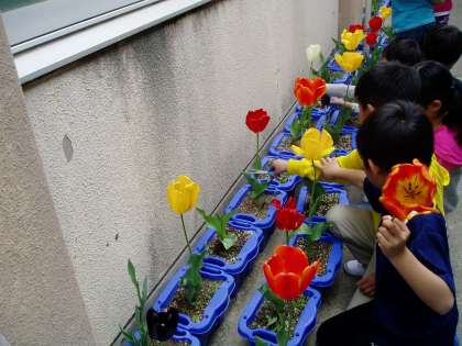 1年で植えたチューリップの花が大きく咲いて少し花弁が落ちて散りかかってきました。そこで,球根を大きくするために花を茎のところから切りました。子どもたちは大事そうに持って帰りました。