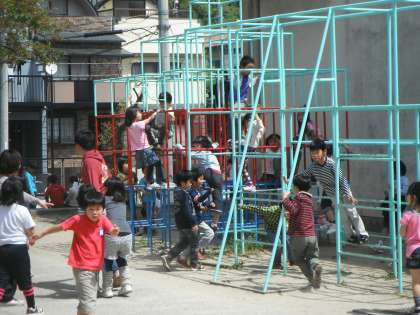 休み時間、1年生は中庭で、遊具やおにごっこをして元気いっぱい走り回っています。