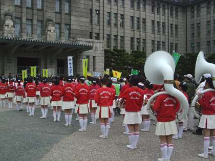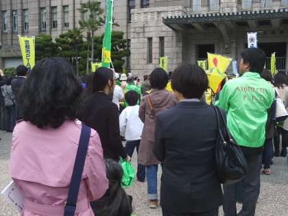 今日は,市P連主催の「人権啓発街頭パレード」に,PTA会長さんとともに参加してまいりました。ここ2・3日の冷え込みとは対象的な暖かな気候に恵まれ,歩いていますと少し汗ばむほどのよい天気でした。このパレードは,5月の憲法月間に先立ち実施されるもので,今回で25回目という継続的な取組です。朝10:30,総合教育センター(四条河原町下ル)に約400名のPTAや教育委員会をはじめとする行政関係者の人々が終結しました。開会式のあと,4つのシュプレヒコール(家族の絆を大切に・子どもの命を守る・児童ポルノ根絶・いじめ撲滅)を確認し,いよいよ公道に繰り出しました。ちょうどお昼前の人権パレードとなり,交通量も少しずつ増えてきていましたが,お昼ころには,ゴールの京都市市役所前に無事到着しました。また,パレードを先導してくたのは,本校卒業生も多く所属している修学院中学校ブラスバンド部でした。