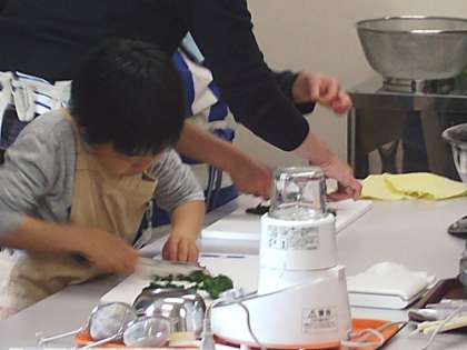 よもぎもちを作る準備にとりかかりました。摘んできたよもぎを水洗いします。そして,食塩と重曹を少々加えたお湯で煮たてます。その後は,細かく切って,すり鉢でさらに細かく…。包丁は「猫の手」で。スタッフの方から,注意を受けてから,親子で取り組みます。お母さんの素晴らしいお手本を間近に見ながら,子どもたちは真剣そのもの…。