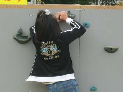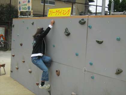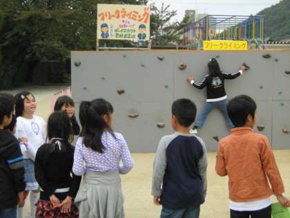 運動場に特設の壁を作ってフリークライミングを行っています。手も足も使って壁を横に移動していきます。結構難しいようで、みんな苦労していました。