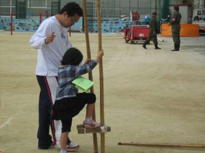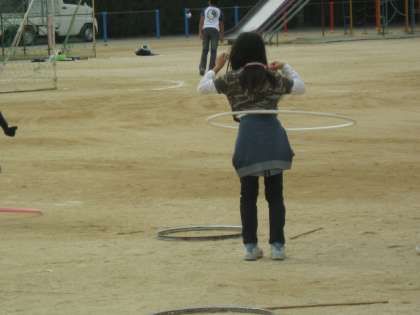 運動場で竹馬・フラフープなどで遊べます。見た目以上に難しそうで、苦労していました。