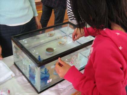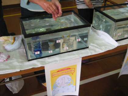水の入った水槽にコップなどが沈めてあり点数が決まっています。一円玉を上から落として上手に入れば得点になります。水の抵抗で思い通りに一円玉が落ちません。難しいです。