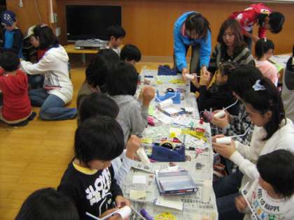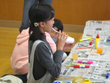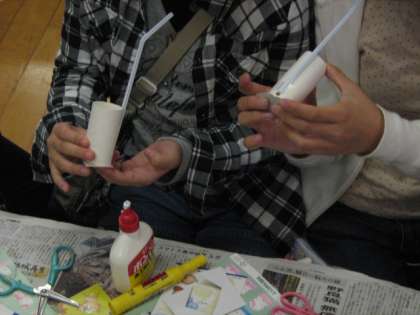 細い筒に穴を開け、紙を張ってストローをつけ笛にします。いい音がして楽しいですよ。