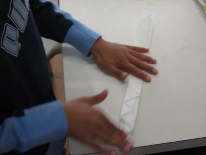 紙を折りたたんで、絵の具につけます。広げるときれいな模様ができます。折り方や色のつけ方で出来上がりの模様がかわってきます。広げるときが楽しみです。