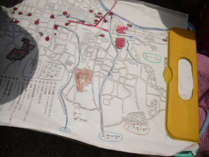 教室にもどると,白川通りの様子をメモした後,今日歩いたコースを校区地図に書き入れました。すると,子どもから,