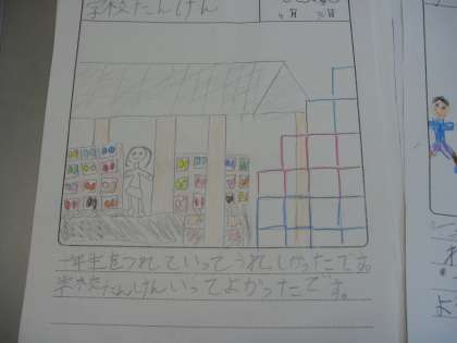 先週の学校たんけんの写真を見て,学校たんけんのことを思い出し,生活カードをかきました。ドキドキしていたけれど,次第に仲良くなれたことや手をつないでがんばって案内できたことなどかいていました。