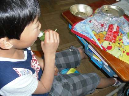 今日の給食に「子どもの日」にちなんで、ちまきがでました。子どもたちは、笹をむくところからわくわくしている様子で、笹の中から真っ白なちまきが出てくると興奮していました。食べた後には、「おいしかった!」という声とともに、子ども達の笑顔を見ることができました。