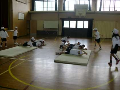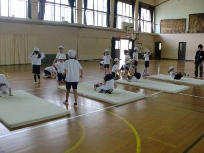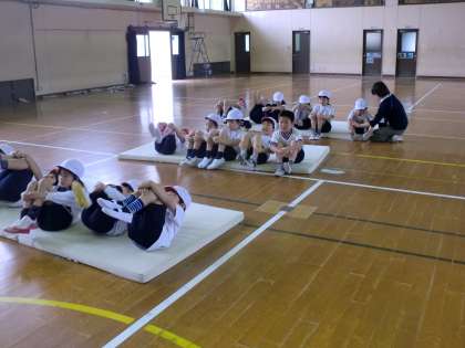 1年生の時に練習した「ゆりかご」「いもむし」「かえるとび・うまとび」などだいぶ上手になってきました。これから前転や後転の練習をしていきます。