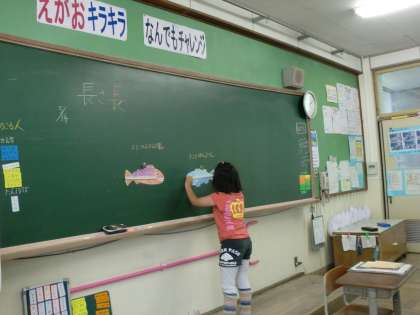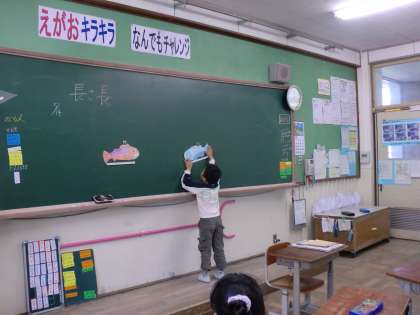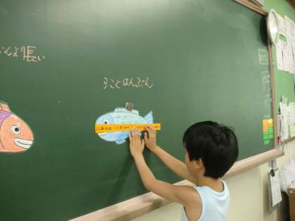 算数の学習,「長さ」の学習に入ります。今日は,二匹の魚の長さ比べをしました。子どもの発想はすごいものです。比べるときには,『手を使う』『長い棒を使う』『何かものを使う』『重ねる』などいろんな意見が出ました。