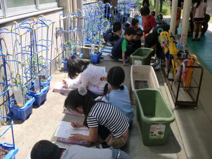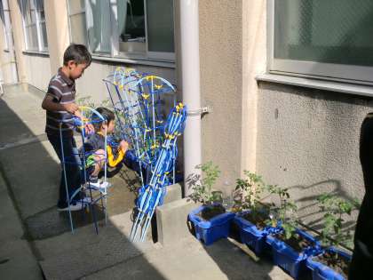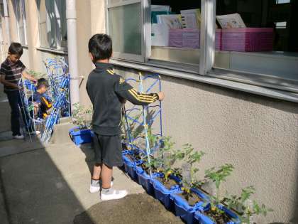「やさいをそだてよう」ということで『ミニトマト』を植えましたが,背が高くなっていたので支柱をつけました。これからどんどん大きくなっていくので早い目に支柱を付けました。水やりが少し大変ですが大きくなることを願っています。