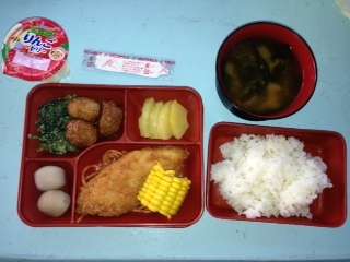 今日の夕食は スペシャル弁当です。温かいお味噌汁もついていて,お代わりもいっぱいしました。