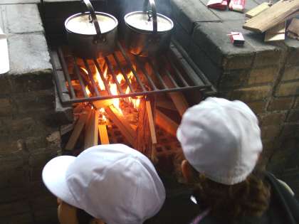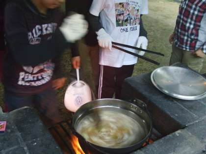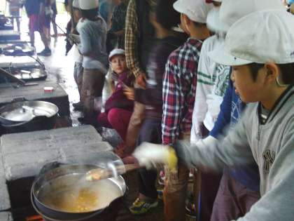 野外炊事は予定通り実施しました。各グループに分かれ,カレーと炊飯に精を出しました。なかなか木に火がつかないグループもあったり,カレーの具がやわらかくならなかったりして,子どもたちは苦戦の連続でした。でも,チームワークよく和やかに進めることができました。外は雨で気温が今ひとつ上がらない夕刻となりましたが,野外炊飯場は活気に溢れていました。