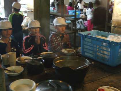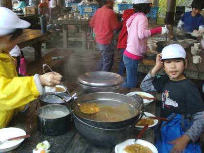 完成までにはずいぶん時間のかかったグループもありましたが,できばえはよく,どのグループも満足な顔で,おいしくカレーライスを食べることができました。辛抱強く焚いたおかげで,人参もジャガイモもやわらかくなりました。「めっちゃ,おいしい!」「こんなカレーは初めてや…。おいしすぎる。」などと口ぐちに発しながら,みんなと作ったカレーを味わいました。中には,炊飯がうまくいかなかったグループもありましたが,多くのグループからもらって,事なきを得ました。失敗は成長の素。次回(3日目)の野外炊飯ではしっかりやってくれるでしょう。