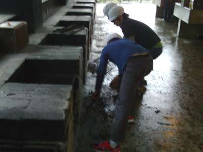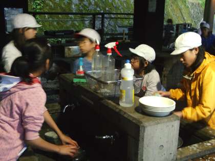 カレーを食べたグループから,後片付けに入ります。食器・鍋・かまど・テーブルなど,役割毎に片付けます。しかし,しっかり洗えていないと二重チェックに合い,やり直しとなります。最終的には,山の家のスタッフにOKをもらって完了です。次に使う人が気持よく使えるよう,汚れを完全に落とします。何度もOKをもらえずやり直す姿も見られましたが,最後まで粘り強くきれいにできました。そんな中で,一発OKをもらえたグループからは歓声もあがっていました。