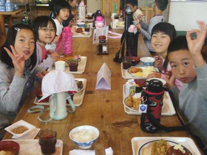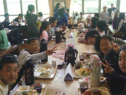 山の家に来て,初めて食堂での食事となった朝食。まずは,山ブドウジュースOR牛乳のセレクトから始まる内容豊かなメニュー。パン食・ごはん食のどちらにも対応したバイキング形式です。昨夜の野外炊飯が夕刻だったので,子どもたちは空腹状態。間食も一切とっていないので,みんな自分のお皿におかずをいっぱいとって,楽しく食べていました。今日は,これからハイキング。雨は上がっています。気温も上がりそうな気配です。
