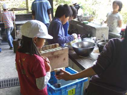 野外炊事は,山の家の活動で3回採り入れています。そして,豚汁づくりが最終回。子どもたちも回を重ねる毎に,手際よく進められるようになってきています。特に炊飯は,前回よりも数段のレベルアップです。また,豚汁も食欲をそそる味付けになっているようです。「いただきま〜す」「美味しい、最高や!」「こんなおいしいもの初めてや!」各グループでは,自分たちの作った料理に対し,「御苦労さん」という意味も込めて互いにほめ合っているようでした。