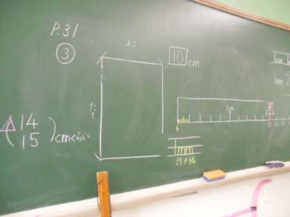 長さの単位「mm」も学習し,いろいろな長さを測っています。これから,決められた長さの直線をかいたり,長さの計算をしたりしていきます。難しくなりますが,がんばって習得してほしいと思います。