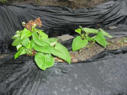 サツマイモを植えた時は,ひょろっとした1本の苗でした。雨が降ってくれたので少し大きくなって葉っぱも増えてきました。葉っぱや茎が伸びていき畑いっぱいになればいいなと思っています。