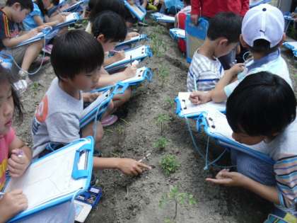 今日の生活科の学習では,以前植えたミニトマト・ピーマン・オクラの苗を観察しました。眩しいほどの日差しの下,すくすくと育った苗は元気よく葉をつけていました。子どもたちはそれぞれの葉の特徴を捉えて観察シートに書き込んでいました。