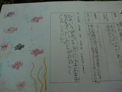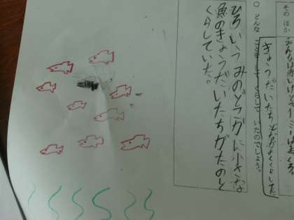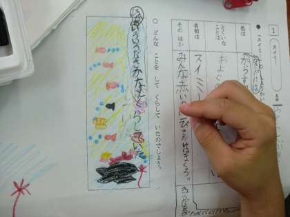 スイミーのことを今日は,説明を書いていきました。文字で書いていないことも考えて書いている子もいます。だいぶ読み取りができてきました。