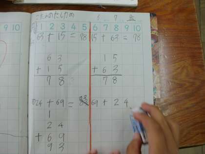 「たし算のひっ算」の学習が進んできました。子どもたちは計算する順番や書き方など説明ができるようになってきました。