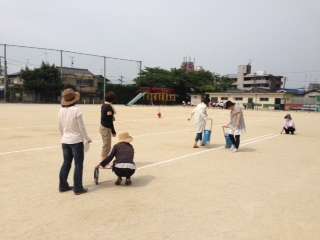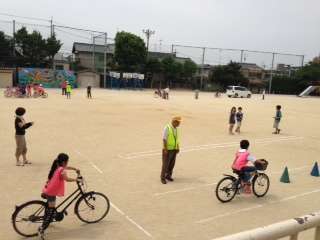 始まるまでに保護者の方や見守り隊の方が,運動場に実技走行コースの白線をかいてくださいました。
