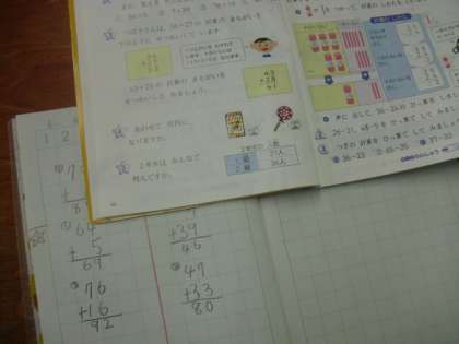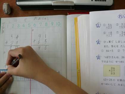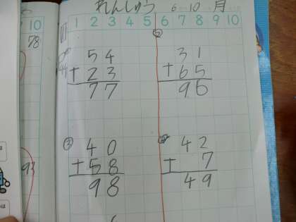 今日の算数の学習では,たし算の筆算の復習をしました。それぞれの位を縦にそろえたり,一の位が繰り上がる場合に,十の位に1を書き入れるなどの書き方に気をつけて学習を行いました。まだ,一の位の数字を十の位に書いたり,十の位に繰り上がる1を書き忘れたりする子どもも見られるので,何度も繰り返して学習を行っていきたいと思っています。