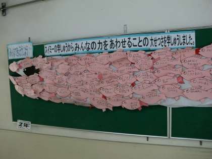 北校舎入口の掲示版には,スイミーの赤い魚たちを掲示しています。スイミーのお話を読んで,協力することの大切さを学び,それを小さな赤い魚に書きました。