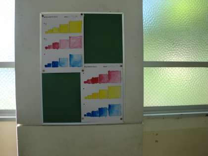 また,教室の前には,初めて絵の具を使った日の作品を数点掲示しています。