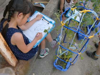 ミニトマトがずいぶん大きくなります。そこで,茎の長さを測りました。1メートル近く伸びている子がいます。トマトを詳しく観察してシートに記録しました。実の数もずいぶん増えています。その実が少し色づいてきています。赤くなるのが楽しみです。